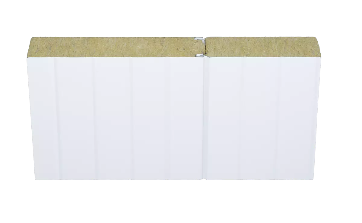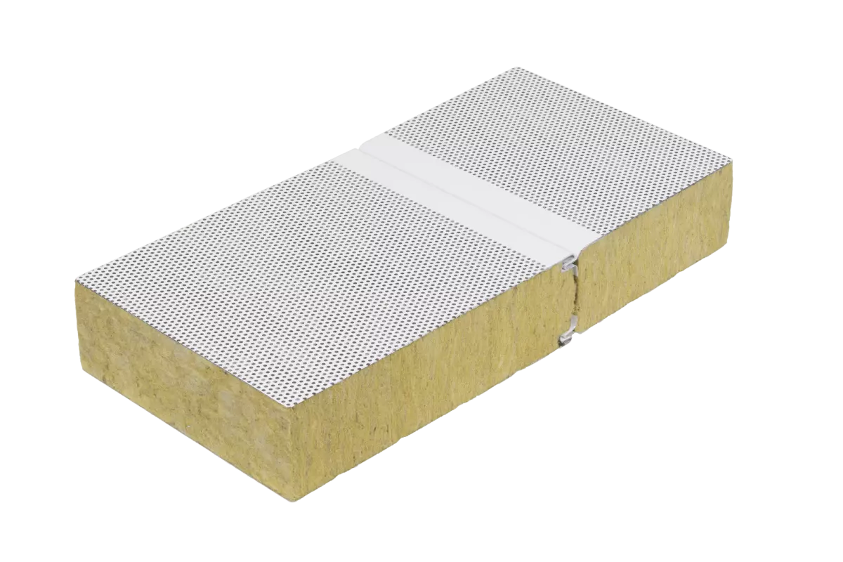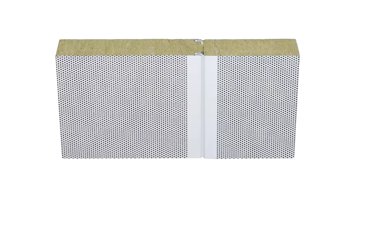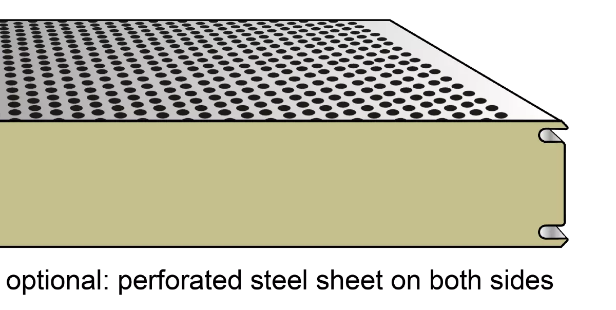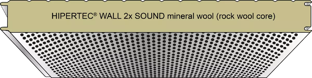 Hipertec® Wall Sound is a sandwich panel with an insulation core of mineral wool and steel cover sheets, the internal sheet being perforated.  This panel is perfectly apt for buildings with high requirements on sound insulation and sound absorption. The design of the internal sheet improves room acoustics substantially. This system (patented by Metecno) uses a special fleece material as trickle protection between the internal sheet and the mineral wool core.